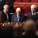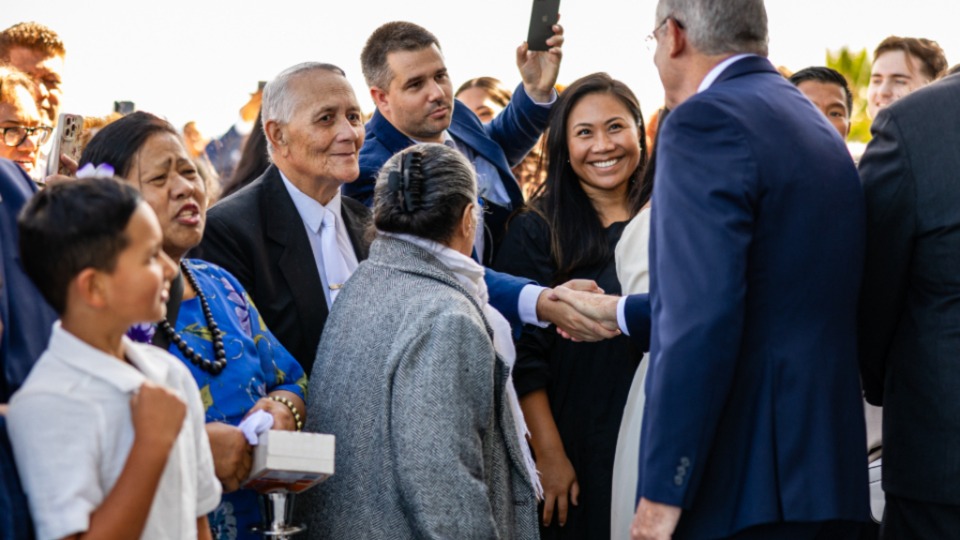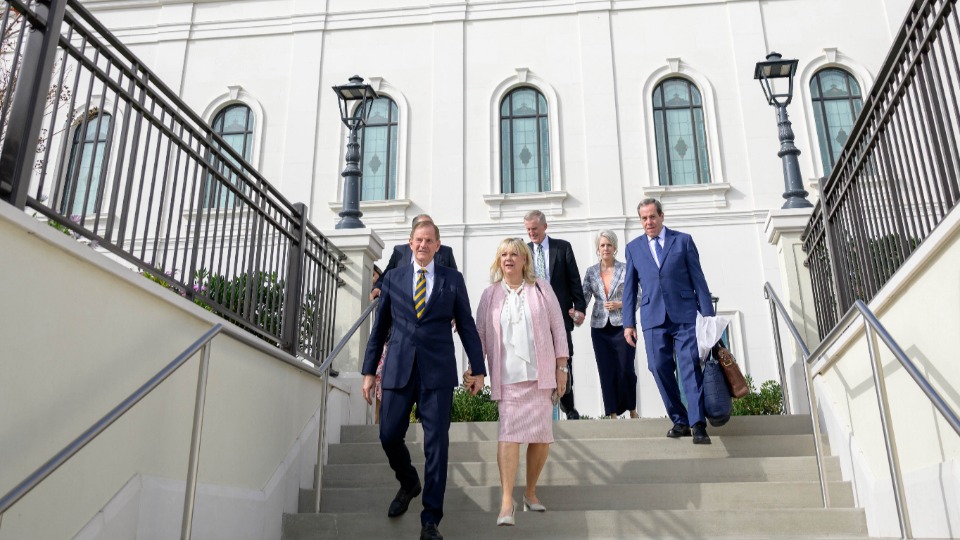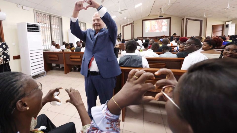Старейшина Дитер Ф. Ухтдорф от Кворума на дванадесетте апостоли на Църквата на Исус Христос на светиите от последните дни и неговата съпруга, Хариет, поздравяват хора, преди да говорят на духовното послание за пълнолетни младежи в неделя, 2 февруари 2025 г., в Центъра „Мариот“ в кампуса на Университета Бригъм Йънг в Прово, Юта.2025 by Intellectual Reserve, Inc. All rights reserved.Ръководители на Църквата споделяха своята любов към Христос и с граждански и правителствени лидери. Един от примерите е от месец май, когато старейшина Роналд А. Расбанд от Кворума на дванадесетте апостоли посети министър-председателя на Кот д’Ивоар Робер Бьогре Мамбе в неговата частна резиденция в Абиджан.