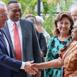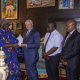 Старейшина Роналд А. Расбанд от Кворума на дванадесетте апостоли подарява малка статуя на Христос на министър-председателя на Кот д’Ивоар Робер Бьогре Мамбе в неговата частна резиденция в Абиджан на 24 май 2025 г., събота.2025 by Intellectual Reserve, Inc. All rights reserved.Апостолите също така каниха другите да следват ученията на Христос чрез опазване на земята и грижа за Божиите чеда.